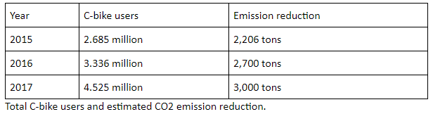 It is believed that encouraging the use of public transport can effectively reduce carbon emissions. By providing a public bicycle rental system (CityBike, hereinafter referred to as "C-bike"), the public is provided with convenient low-carbon transportation options. Kaohsiung City promoted the first public bike rental system in March 2009 to provide convenient ways for people to get bikes. People use credit cards or "iPASS" to rent bikes; they can rent bikes from one C-bike station and return them to another. It is a convenient system, and the number of users exceeded 4 million in 2017. Currently, there are 450 C-bike stations, providing 3,800 C-bikes for public rental.